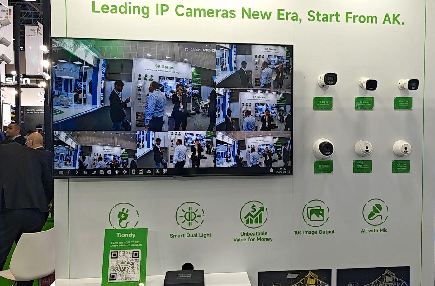 为应对全球市场多元化的需求,天地伟业本次重点展示了60余款核心产品,全面覆盖家用摄像机、项目型摄像机、AI大模型录像机、All in One服务器四大产品线,致力于提供从基础安防到高端智慧城市建设的全栈式解决方案。各地客户结合自身需求关注着不同产品,但都不约而同地为天地伟业的产品实力点赞。欧洲客户对LK系列在复杂光线下的出色表现与AI智能分析能力表示赞赏;非洲客户对无电无网摄像机兴趣浓厚;海湾地区工程师则更关注SK、LK系列在极端环境下的稳定性以及All in One服务器的便捷部署。此外,Tian系列及K系列所体现的高效中心化管理能力,也吸引了众多寻求消费升级与商业效能提升的客户。